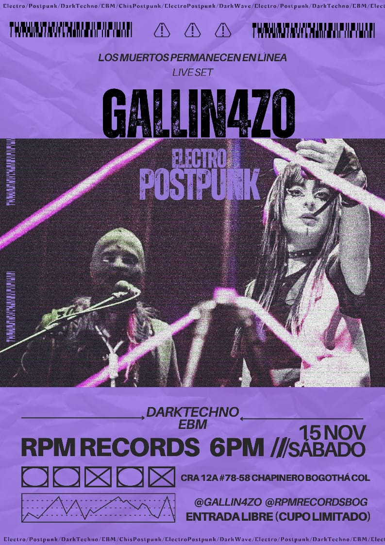 El dúo ElectroPostpunk Gallin4zo continúa expandiendo su universo sonoro y presentará en vivo parte de su nuevo material este 15 de noviembre a las 6:00 p.m. en las Sesiones RPM Records (Bogotá) con entrada libre y aforo limitado.